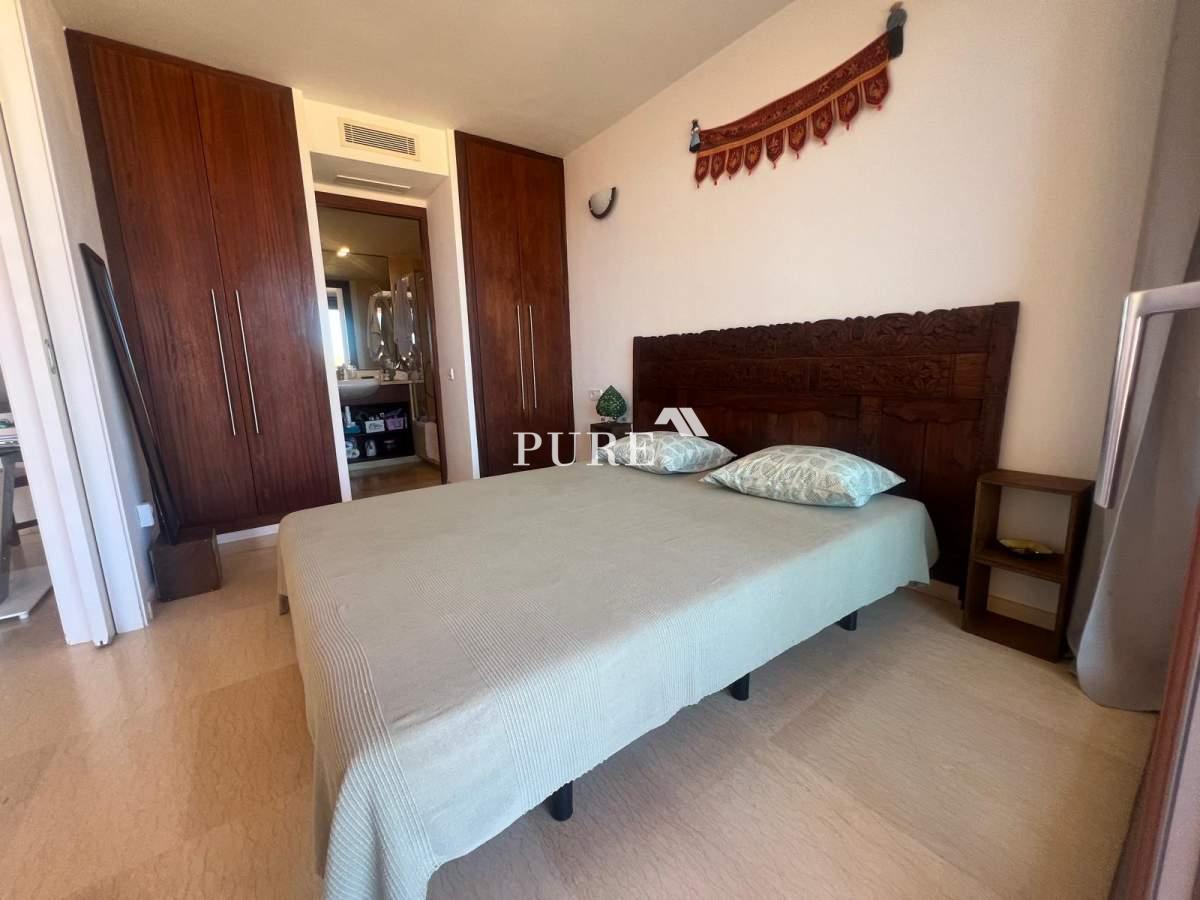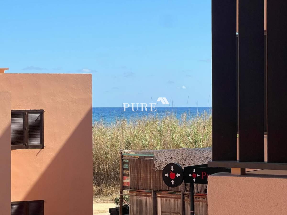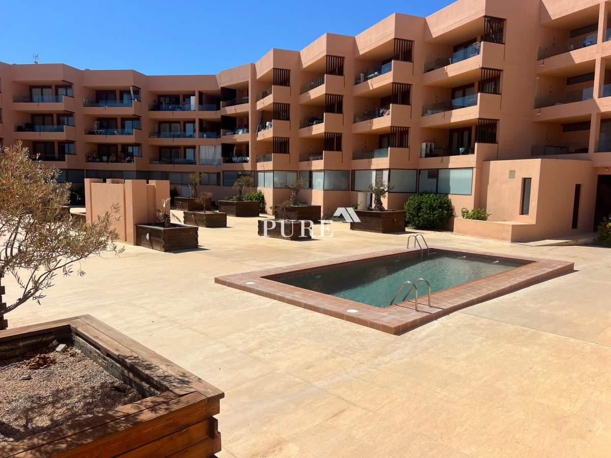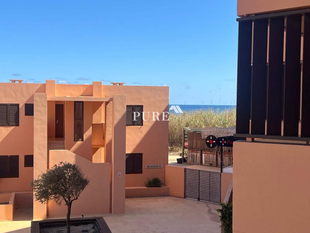 The apartment is part of a large terracotta-coloured residential complex situated directly in front of the beach. Residents can enjoy the communal swimming pool and easy access to Playa d’en Bossa’s finest area, surrounded by dunes and some of Ibiza’s most renowned restaurants such as Zazú and Playa Soleil. Despite its prime location, the setting remains quiet and relaxed, offering the perfect balance between tranquillity and proximity to lively hotspots.