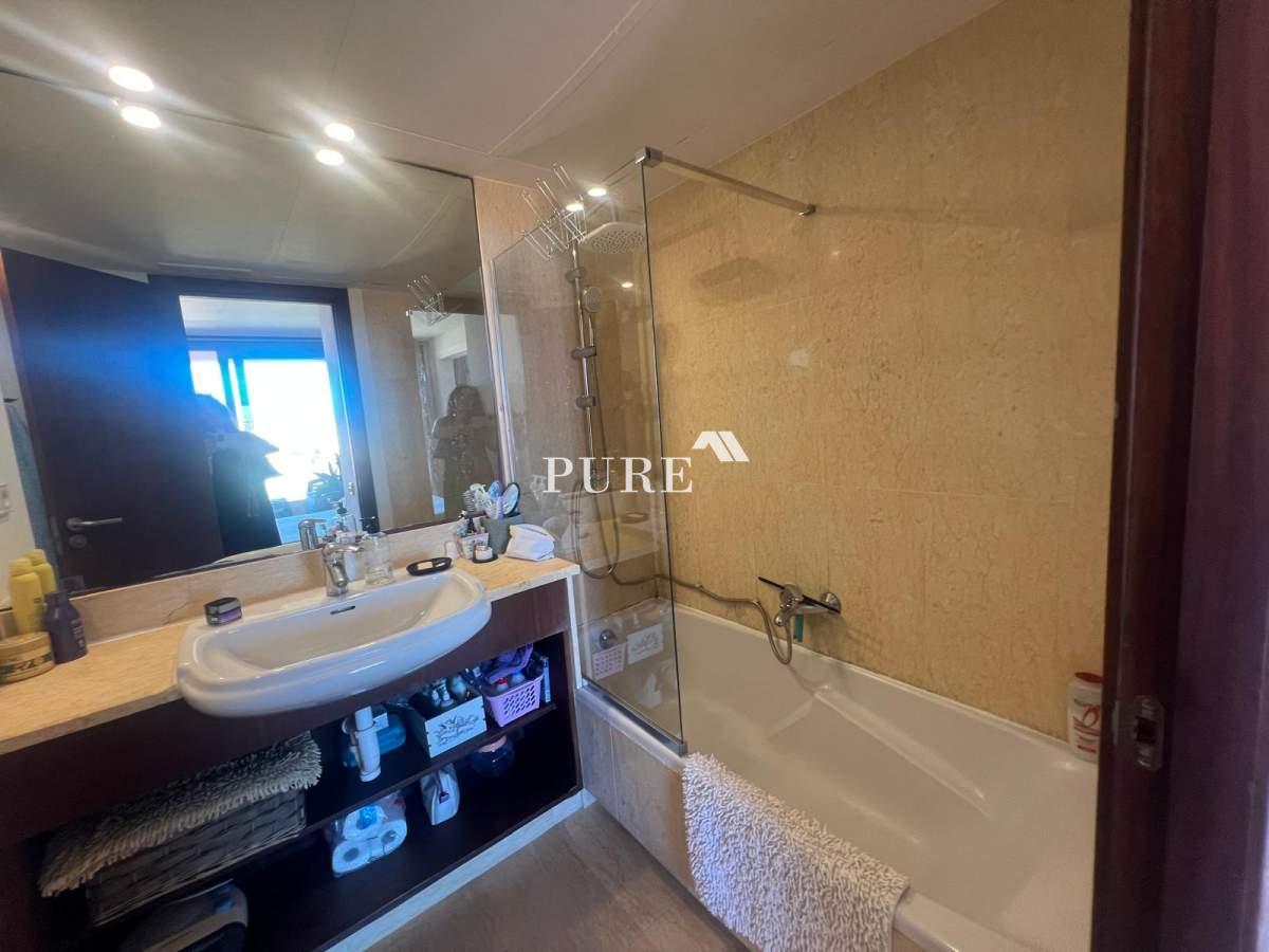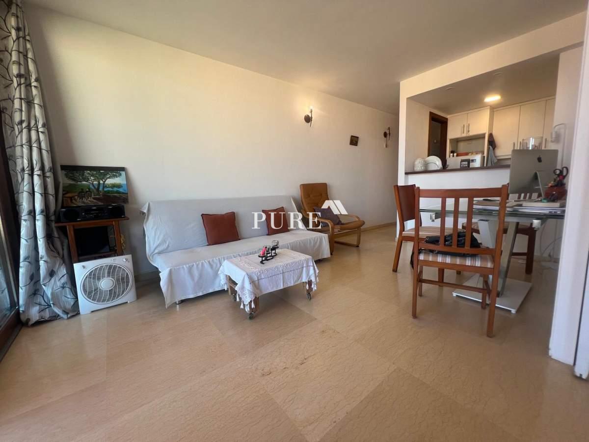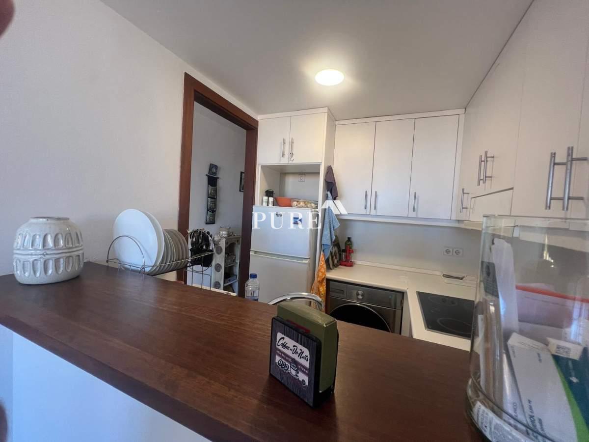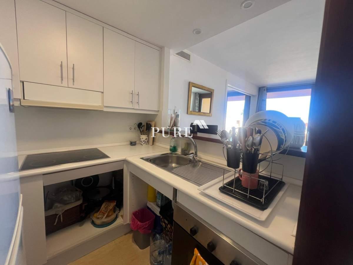 The living area is bright and welcoming, opening directly onto the terrace where you can enjoy the fresh sea breeze and Mediterranean light. The modern, fully fitted kitchen is cleverly integrated with the living space and features a bar counter, ideal for casual dining or entertaining.