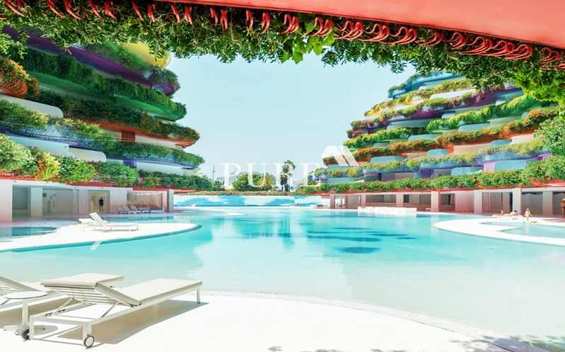 The apartment features a bright and spacious layout with floor-to-ceiling windows that open onto a generous terrace, providing a stunning view of the large lagoon swimming pool. The interior design blends modern lines with high-quality finishes, featuring an open-plan living area, a fully equipped kitchen with premium appliances, and elegantly appointed bedrooms.