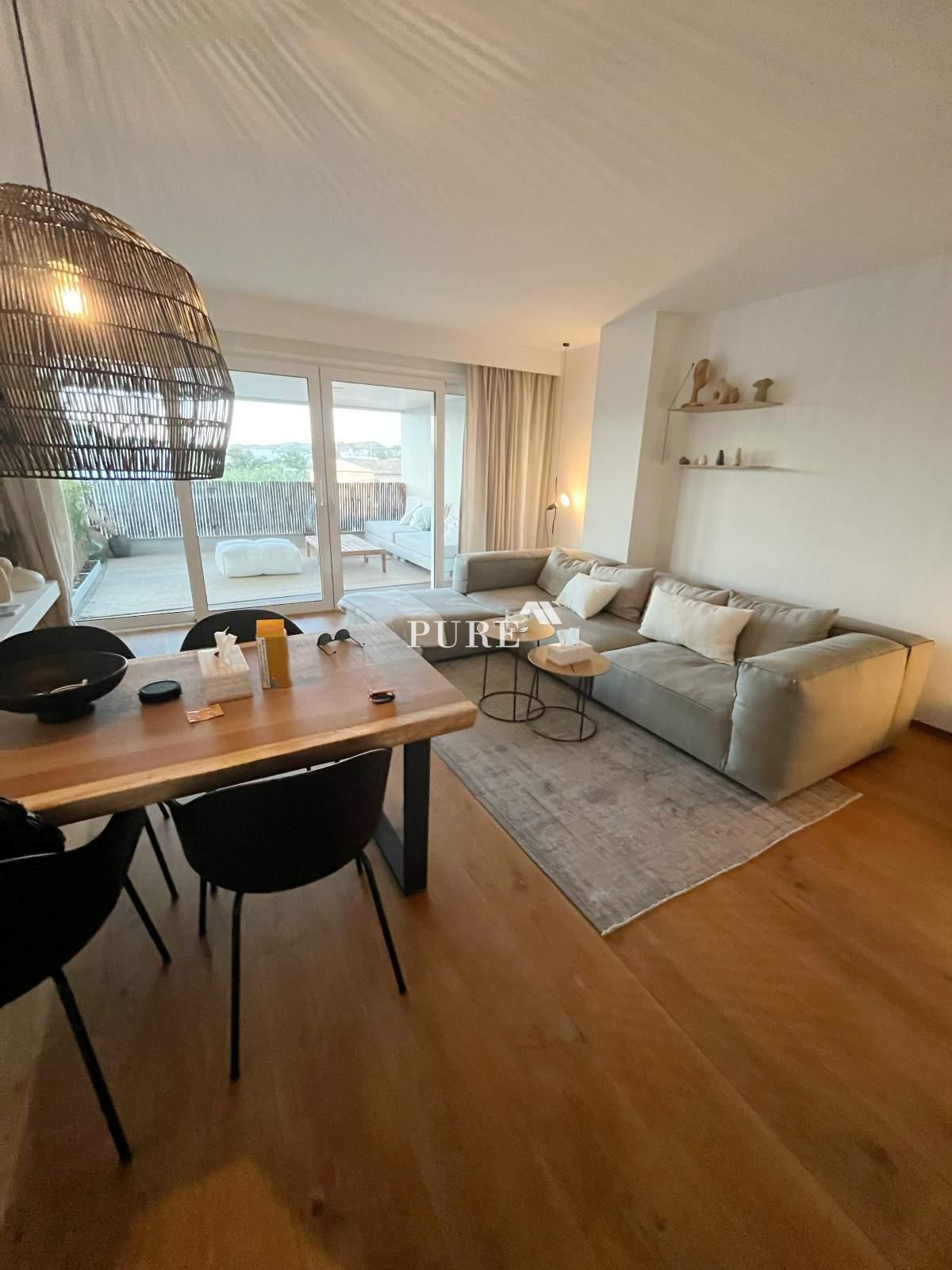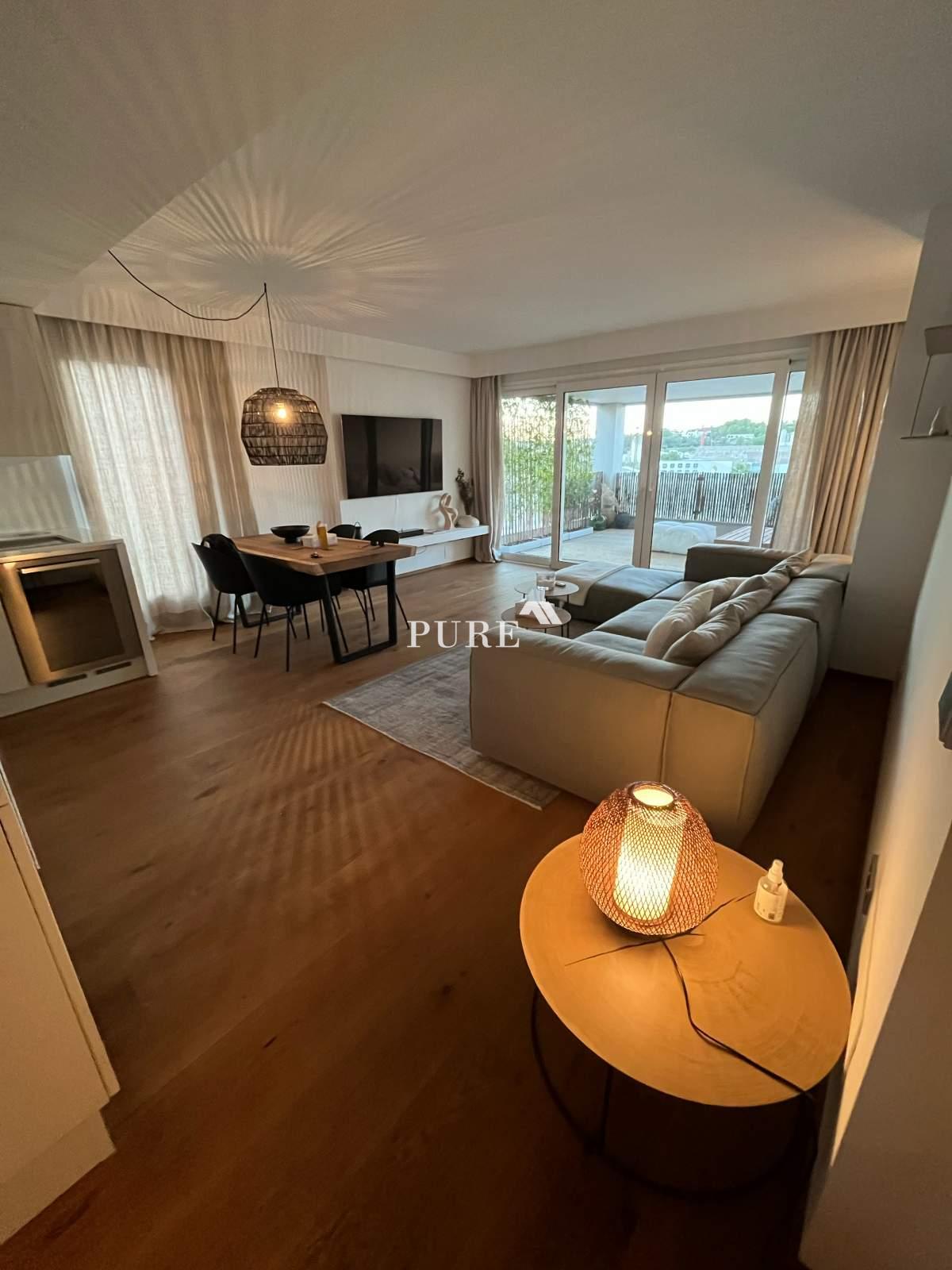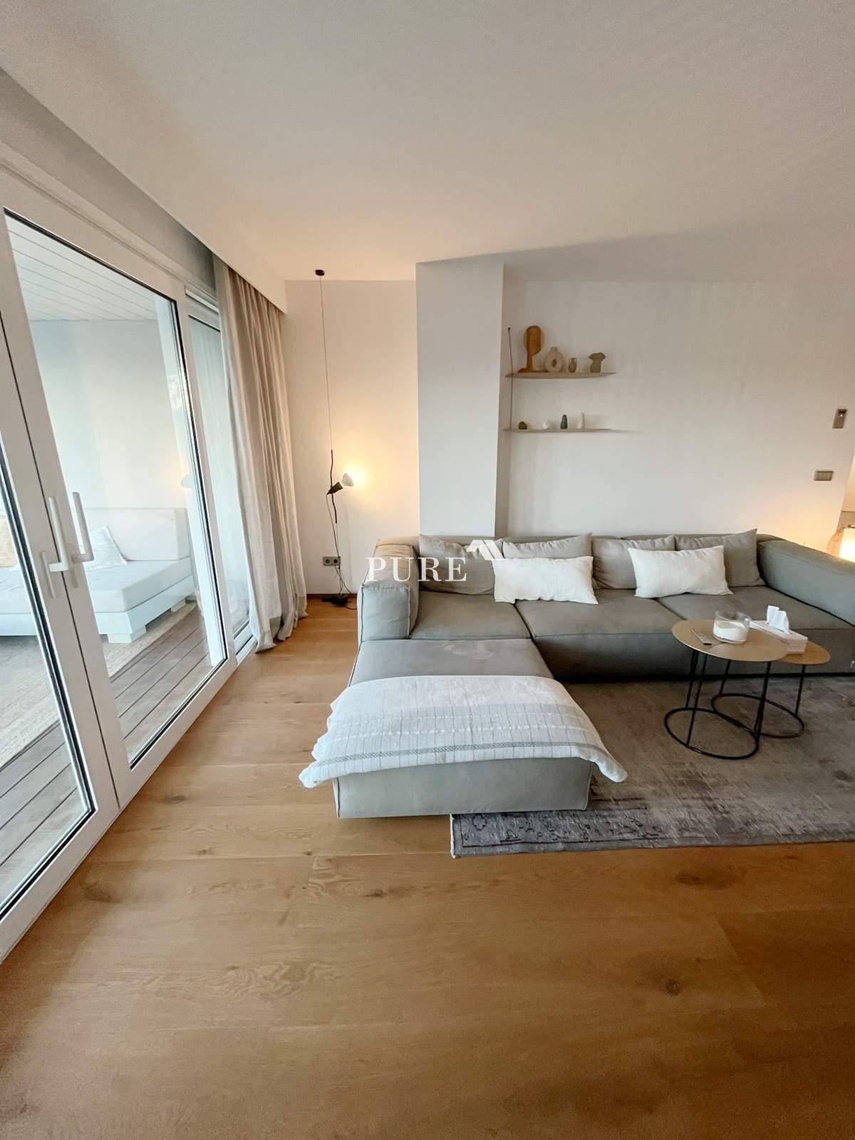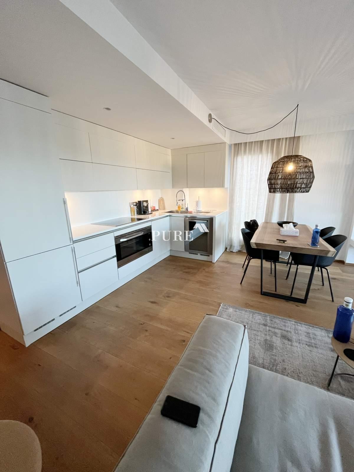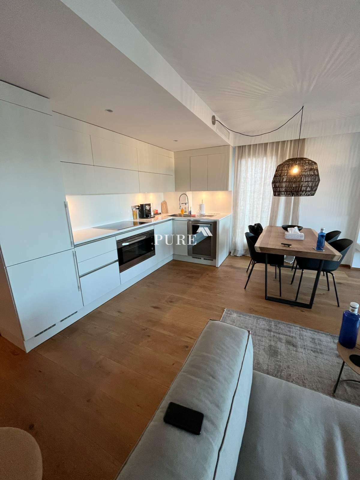 La cuisine ouverte communique harmonieusement avec le grand séjour, créant une atmosphère moderne et chaleureuse. De là, des portes-fenêtres coulissantes s'ouvrent sur une terrasse privée, idéale pour se détendre ou recevoir des invités. L'appartement comprend également un canapé-lit d'appoint, augmentant ainsi la capacité d'accueil.