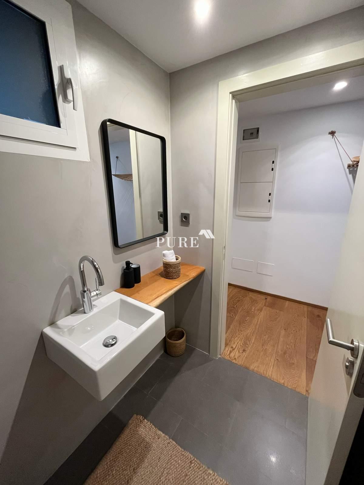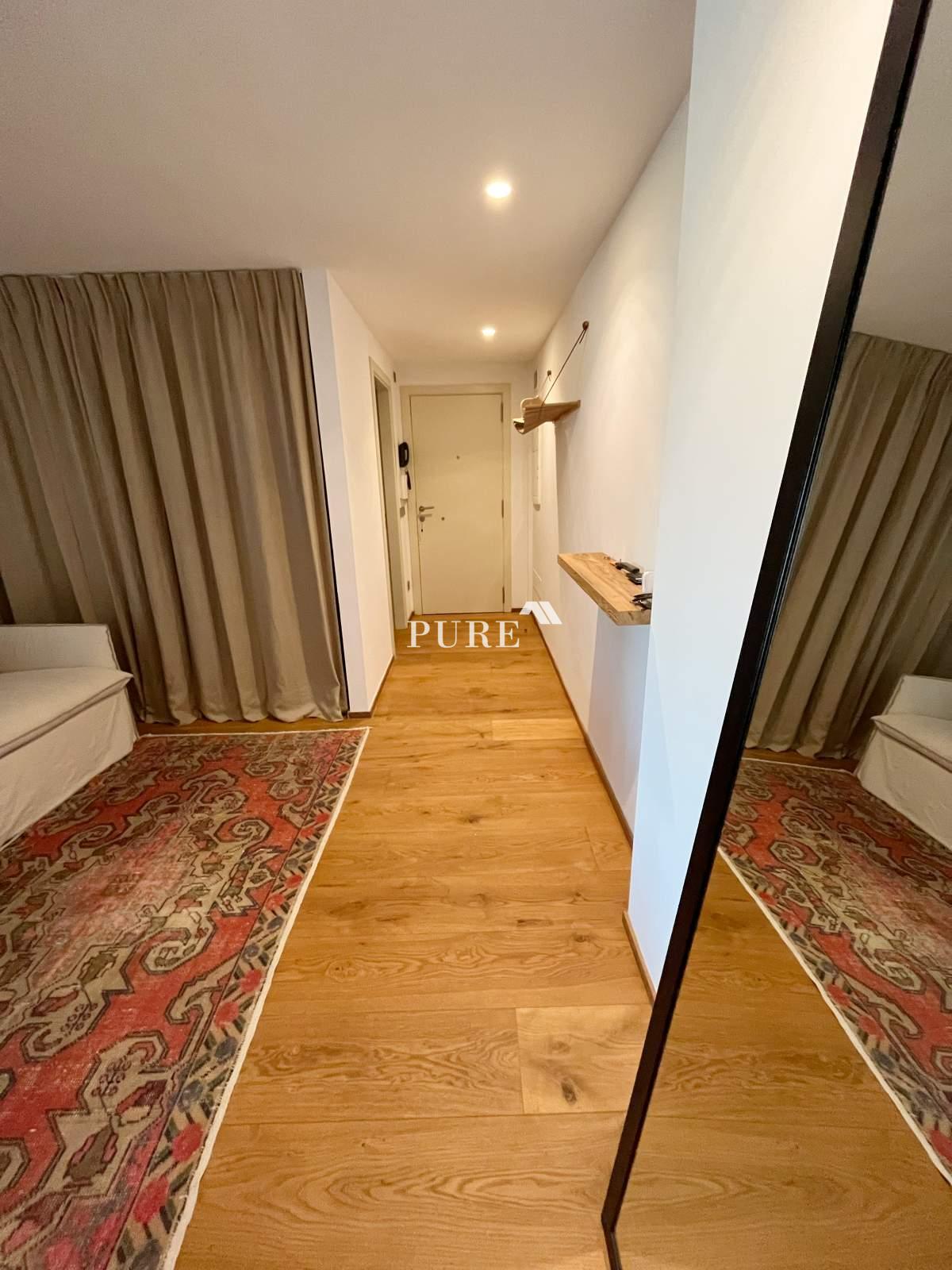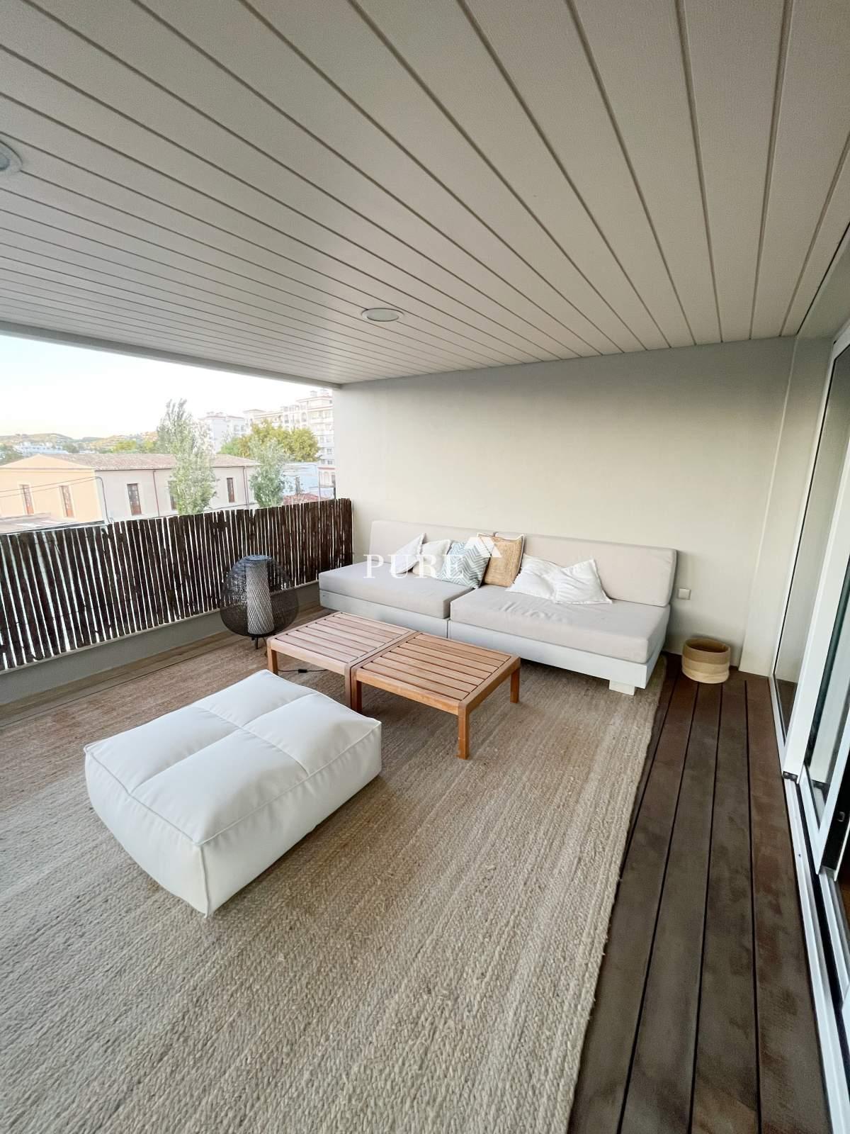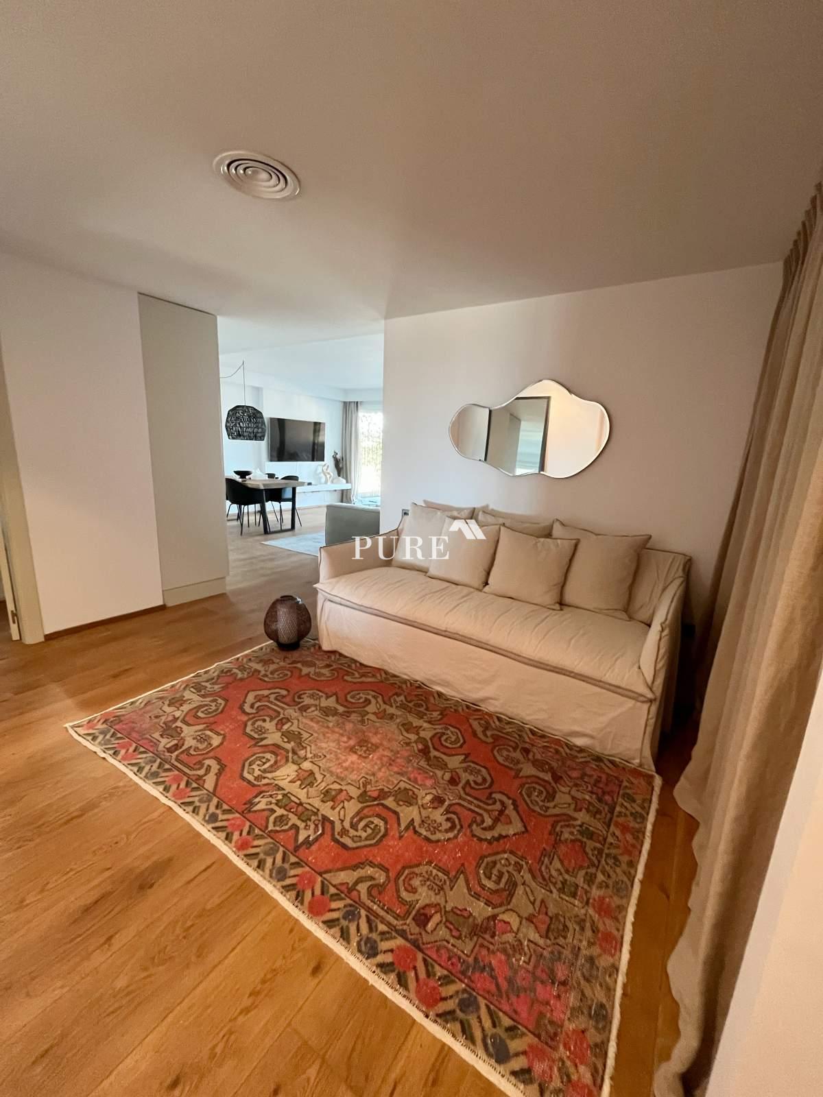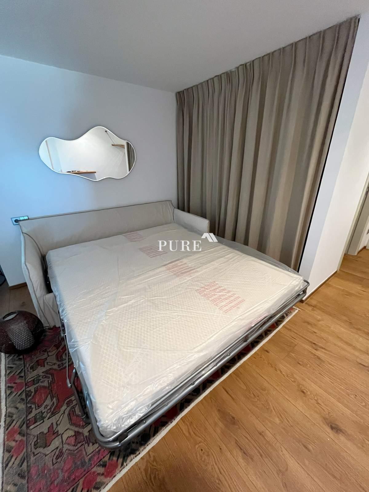 La cuisine ouverte communique harmonieusement avec le grand séjour, créant une atmosphère moderne et chaleureuse. De là, des portes-fenêtres coulissantes s'ouvrent sur une terrasse privée, idéale pour se détendre ou recevoir des invités. L'appartement comprend également un canapé-lit d'appoint, augmentant ainsi la capacité d'accueil.
