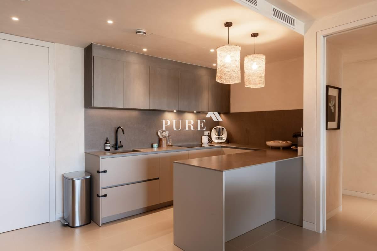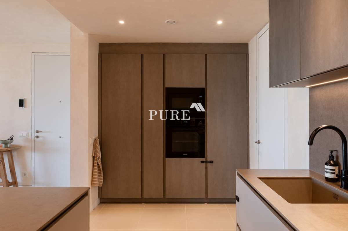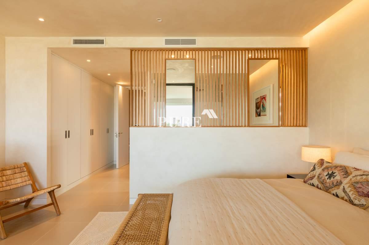 Stap binnen in een verfijnde, open leefruimte, ontworpen voor moeiteloze luxe. Glas van vloer tot plafond laat natuurlijk licht binnen en omlijst het adembenemende uitzicht op zee. Tegelijkertijd creëert de naadloze verbinding tussen de woon-, eet- en keukenruimtes een gevoel van openheid en verfijning. Het interieur is afgewerkt met hoogwaardige materialen, designmeubilair en hoogwaardige apparatuur.
